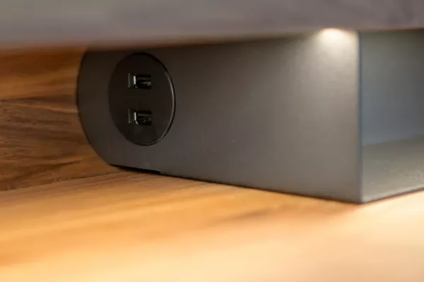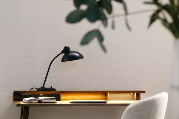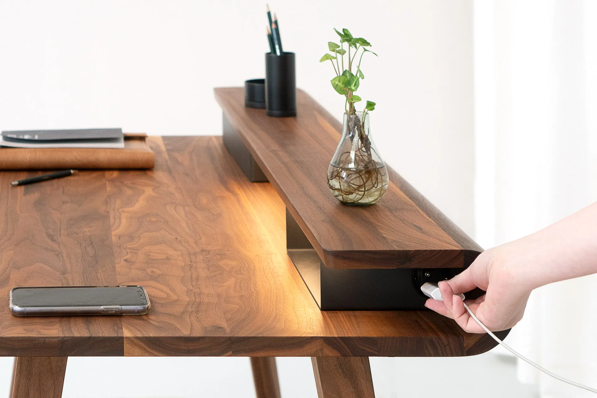 Der Sekretär verfügt über eine praktische zweite Ebene, die als Ablage genutzt werden kann. Ein Schubkasten und eine Box aus gepulvertem Stahl mit Strom- und USB-Anschlüssen bieten perfekte Organisationsmöglichkeiten. Durch die integrierte Induktionsfläche können außerdem alle kompatiblen Geräte kabellos geladen werden und in dunklen Stunden ist der Arbeitsplatz dank integrierter Lichtleiste beleuchtet.